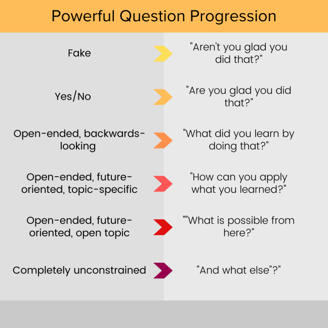 Another practice you will want to add to your coaching toolbox is powerful questions. When you ask someone a question, their brain goes in search of an answer. And the direction and depth of their search depends on the type of question you ask. You want the other person to be as thoughtful and imaginative as possible during your coaching inquiry.